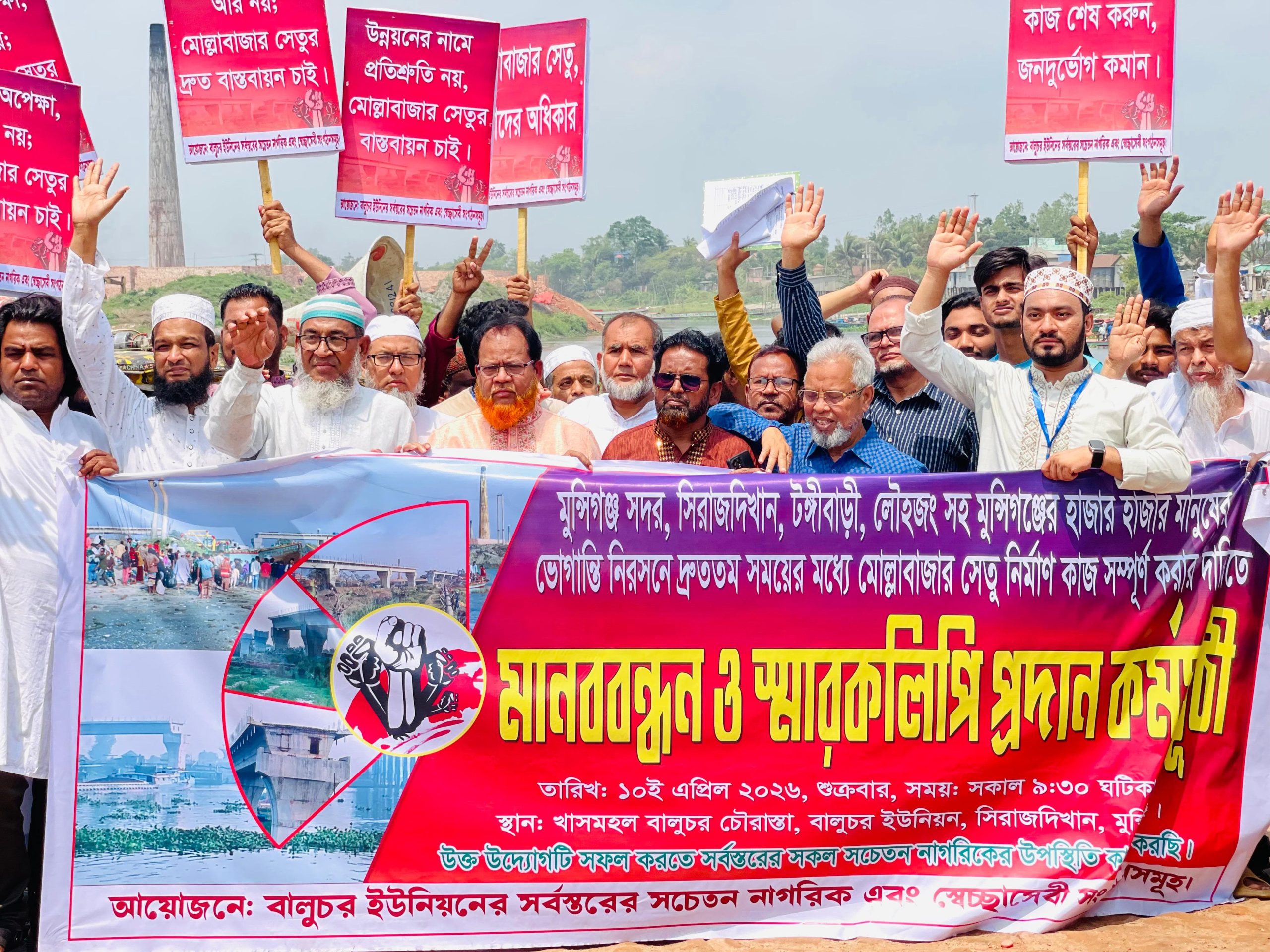 মুন্সিগঞ্জের সিরাজদিখানে মোল্লাবাজার সেতুর নির্মাণকাজ দ্রুত শেষ করার দাবিতে মানববন্ধন ও স্মারকলিপি প্রদান কর্মসূচি অনুষ্ঠিত হয়েছে। শুক্রবার সকালে উপজেলার বালুচর ইউনিয়নের খাসমহল বালুচর চৌরাস্তায় এ কর্মসূচির আয়োজন করে স্থানীয় সচেতন নাগরিক ও বিভিন্ন স্বেচ্ছাসেবী সংগঠন।