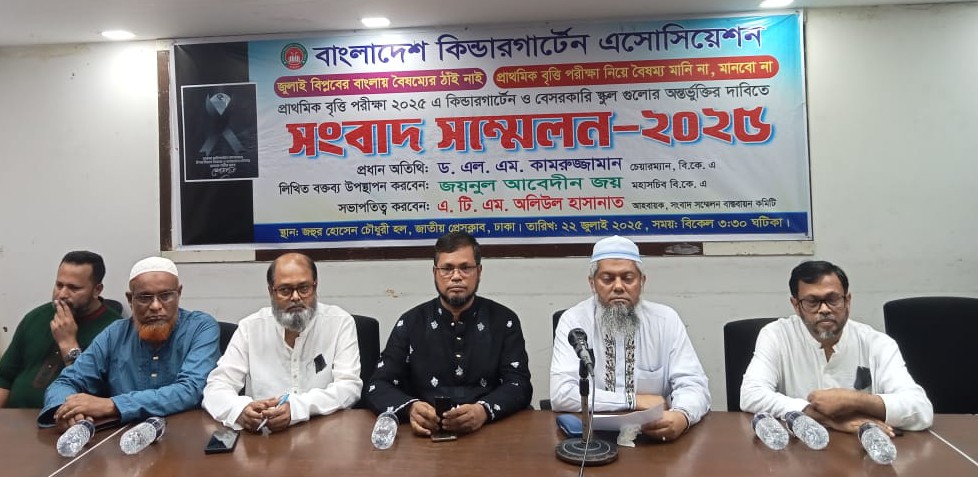 'প্রাথমিক বৃত্তি পরীক্ষায় কিন্ডারগার্টেনসহ সকল স্কুল অন্তর্ভুক্তির দাবিতে বাংলাদেশ কিন্ডারগার্টেন এসোসিয়েশন এর পক্ষ থেকে আজকের সংবাদ সম্মেলন করেন বাংলাদেশ কিন্ডারগার্টেন এসোসিয়েশন। লিখিত বক্তব্য উপস্থাপন করেন সংগঠনের মহাসচিব জয়নুল আবেদীন জয়। লিখিত বক্তব্যে তিনি সকল প্রতিষ্ঠানকে সরকারি বৃত্তি পরীক্ষায় অংশ গ্রহণের সুযোগ প্রদানের কথা বলেন। সংগঠনের সি. যুগ্ম মহাসচিব এএসএম তুহিনের সভাপতিত্বে এবং ভাইস চেয়ারম্যান হামিদুল ইসলাম মিন্টুর সঞ্চালনায় অনুষ্ঠিত সংবাদ সম্মেলনে একই দাবিতে জোড়ালো বক্তব্য রাখেন সংগঠনের চেয়ারম্যান ড.এল.এম কামরুজ্জামান। ২২শে জুলাই, ২০২৫ খিঃ মঙ্গলবার বিকাল ৪ টায় জাতীয় প্রেস ক্লাবের জহুর হোসেন চৌধুরী হলে অনুষ্ঠিত উক্ত সংবাদ সম্মেলনে সংগঠনের মহাসচিব জয়নুল আবেদীন জয় তাঁর লিখিত বক্তব্যে বলেন, গত ১৭ জুলাই ২০২৫ ইং প্রাথমিক শিক্ষা অধিদপ্তর থেকে প্রাথমিক বৃত্তি পরীক্ষা ২০২৫ এর তারিখ উল্লেখ পূর্বক একটি প্রজ্ঞাপন জারি করা হয়েছে। যেখানে বলা হয়েছে সরকারি প্রথমিক বিদ্যালয়ের শিক্ষার্থী ছাড়া বেসরকারি প্রতিষ্ঠান ও কিন্ডারগার্টেনের শিক্ষার্থীরা অংশ গ্রহণ করতে পারবে না। বৈষম্যহীন বাংলাদেশে এ ধরনের বৈষম্যমূলক সিদ্ধান্ত কোনোভাবেই মেনে নেওয়া যায় না। তাই আমরা বাংলাদেশ কিন্ডারগার্টেন এসোসিয়েশন এর পক্ষ থেকে এ সিদ্ধান্তের তীব্র নিন্দা ও প্রতিবাদ জানাচ্ছি। সেই সাথে কঠোর হুশিয়ারি উচ্চারণ করছি যে, অবশ্যই সারা দেশের সকল ধরণের শিক্ষা প্রতিষ্ঠানকে এ বৃত্তি পরীক্ষায় অংশ গ্রহণের সুযোগ দিতে হবে। অন্যথায় পরীক্ষা বাতিল করতে হবে। কোনো অবস্থাতেই বৈষম্যমূলক সিদ্ধান্ত মেনে নেওয়া হবে না। আগামী সাত কার্যদিবসের মধ্যে উক্ত প্রজ্ঞাপন বাতিল করে সকল প্রতিষ্ঠানকে অন্তর্ভুক্ত করে নতুন প্রজ্ঞাপন জারি করতে হবে। অন্যথায় আমাদের কর্মসূচী ধারাবাহিকভাবে দাবি আদায় না হওয়া পর্যন্ত চলতে থাকবে। সংবাদ সম্মেলনে আরও বক্তব্য রাখেন সংগঠনের সি: যুগ্ম মহাসচিব এ.এস.এম তুহিন ও মোঃ রফিকুল ইসলাম রুনু, সাংগঠনিক সচিব মুহাম্মদ আলমগীর হোসেন হেলাল, শিক্ষা সচিব মোঃ নজরুল ইসলাম প্রমূখ। সরকারি প্রাথমিক বিদ্যালয়ের পাশাপাশি কিন্ডারগার্টেন শিক্ষা প্রতিষ্ঠানগুলোর অবদান তুলে ধরে নেতৃবৃন্দ বলেন, পিইসিই পরীক্ষায় কিন্ডারগার্টেনের ফলাফল সরকারি প্রাথমিক বিদ্যালয়ের তুলনায় অনেক ভালো এবং দেশে বিদেশে প্রাথমিক শিক্ষায় সরকারের যে. সাফল্য ও সুনাম রয়েছে তার প্রায় অর্ধেক অবদানই কিন্ডারগার্টেন সমূহের রয়েছে। মাননীয় প্রধানমন্ত্রীর প্রতি ধন্যবাদ জ্ঞাপণ করে সংগঠনের চেয়ারম্যান ড.এল.এম কামরুজ্জামান কিন্ডারগার্টেন শিক্ষার উন্নয়নে স