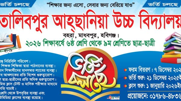 (মো ইপাজ খাঁ মাধবপুর হবিগঞ্জ প্রতিনিধি): চলছে ভর্তি চলছে ঐতিহ্যবাহী তালিবপুর আহসানিয়া উচ্চ বিদ্যালয় ২০২৬ শিক্ষা বর্ষে ষষ্ঠ থেকে নবম শ্রেণী পর্যন্ত ছাত্র-ছাত্রী ভর্তি চলছে। ফর্ম বিতরণের তারিখ ৭ এ